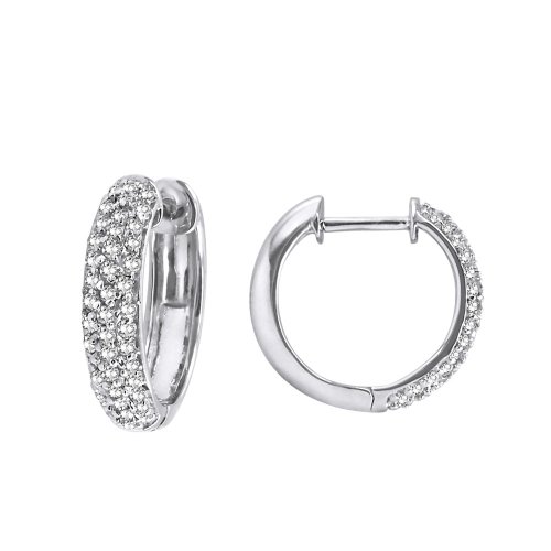 These diamond hoop earrings are a striking accessory for day or night. Offered in your choice of 10 karat white or yellow gold, the round 15mm hoops are paved along the front with three rows of sparkling diamonds. Eighty-six diamonds altogether decorate these classy hoops, for a total diamond weight of 1/2 carat. The earrings are featured on hidden snap posts that lock for a secure fit.
